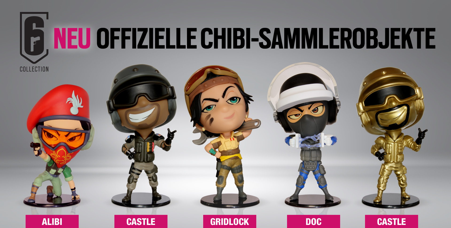 Düsseldorf, 29. Mai 2020 – Ubisoft kündigte die 5. Reihe der Rainbow Six Siege Chibi-Figuren an, welche ab sofort im Ubisoft Store vorbestellt werden können. Die neue Reihe enthält vier neue Figuren: Alibi, Doc, Castle und Gridlock, sowie Castle Gold (exklusiv im Six Collection Bundle; nur im Ubisoft Store). Dazu beinhaltet jede Figur zusätzlich einen einzigartigen Code, der einen Waffen-Talisman im Spiel freischaltet.