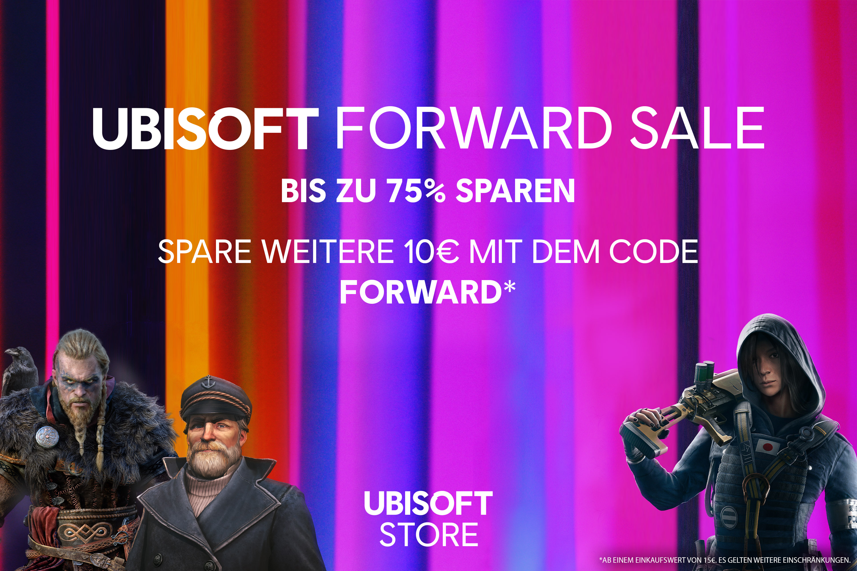 *Ab einem Einkaufswert von 15 €. Gilt auch für rabattierte Produkte. Gilt nicht für Ingame-Währungen, Vorbestellungen, das Ubisoft+ Abonnement und physische Produkte (Bücher, Comics u.Ä). Der Rabatt ist nicht kombinierbar mit dem Treueprogramm. Mehr Informationen unter https://store.ubi.com/forward-coupon/