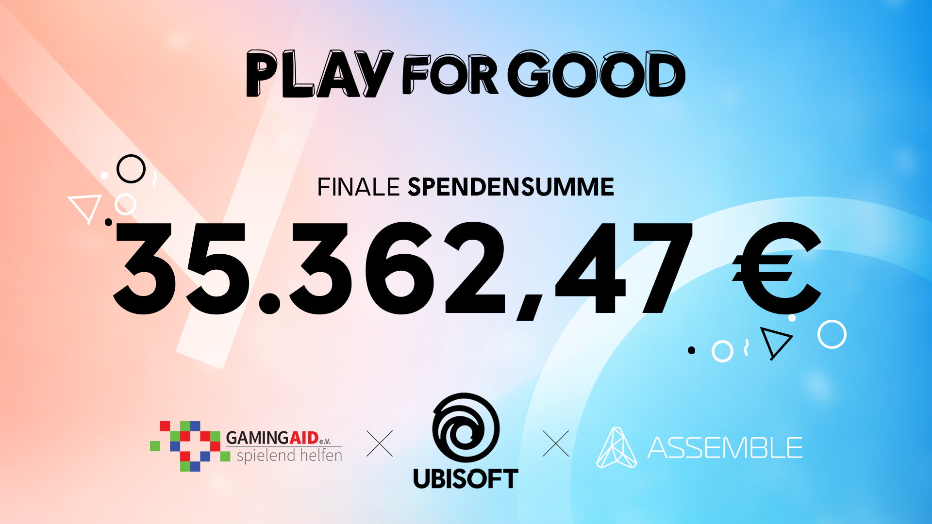 Düsseldorf, 30. August 2021 – Im Rahmen der gamescom 2021 sammelten die deutschen Ubisoft-Studios (Ubisoft Düsseldorf, Ubisoft Mainz und Ubisoft Berlin) gemeinsam mit der Ubisoft Deutschland GmbH, Assemble Entertainment und Gaming Aid e.V. im Rahmen eines Charity-Livestreams unter dem Namen „Play for Good – Gaming hilft Flutopfern“ Spenden zu Gunsten der Flutopfer der Hochwasser-Katastrophe vom Juli 2021 in Deutschland. Insgesamt kommt die Initiative auf eine finale Spendensumme in Höhe von 35.362,47 €.