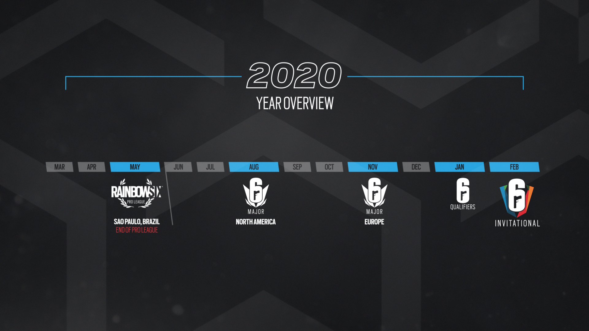 - Vier regionale parallele Programme im Laufe eines Jahres. Ein Turnierjahr des Rainbow Six E-Sports, bekannt als Season, wird in vier Quartale eingeteilt. Die ersten drei Quartale heißen Stages, die jeweils mit einem Major abschließen, in denen die vier besten Teams aus jeder Region am Ende einer bestimmten Etappe zusammenkommen, um gegeneinander anzutreten. Das vierte Quartal ist den regionalen Finals und den Relegationsspielen gewidmet und führt zum Six Invitational, das am Ende der Season das beste Team weltweit krönen wird.